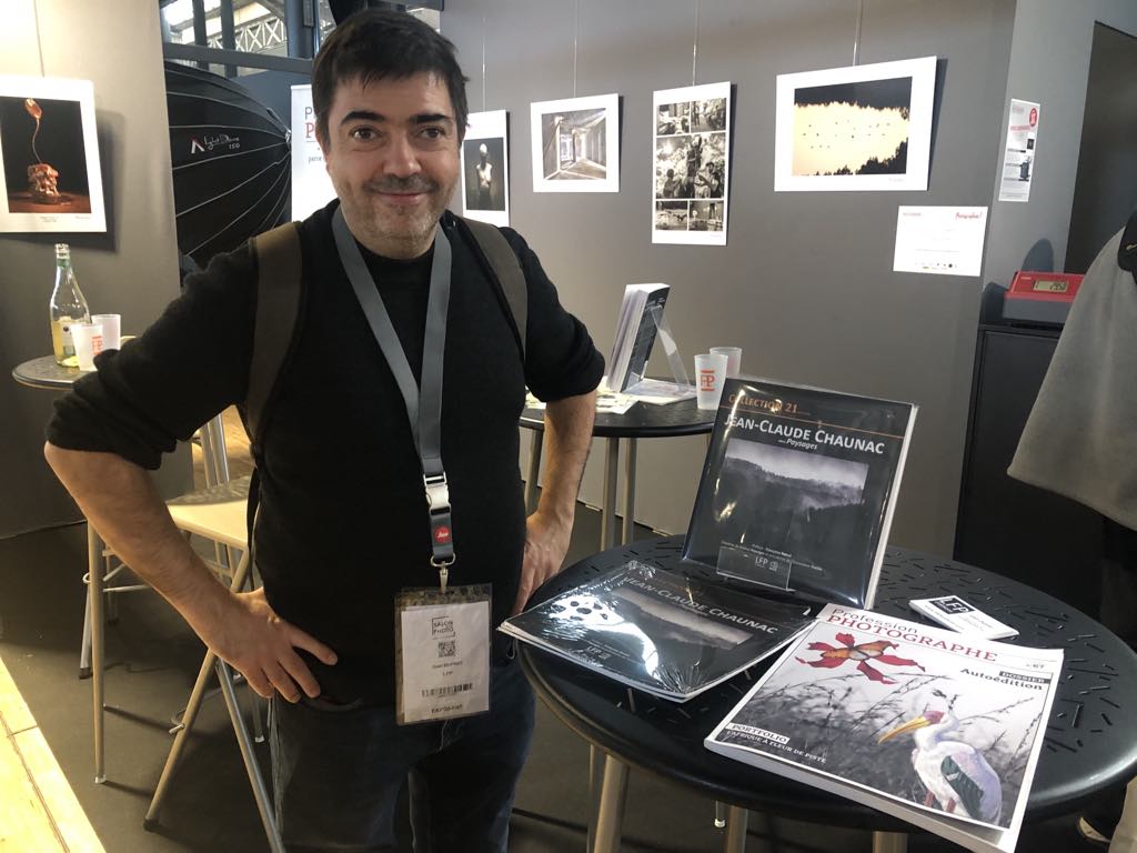 Photo réalisée au salon de la photo 2024 sur le stand de Profession photographe lors d’une séance de dédicace de Jean-Claude Chaunac pour son art-book Paysages.